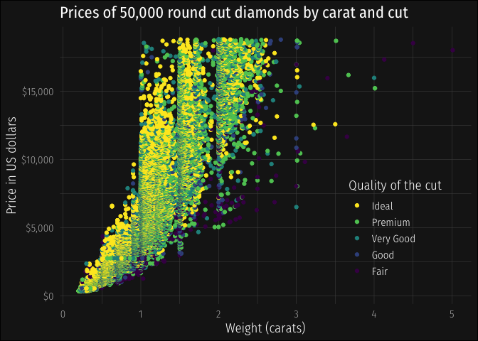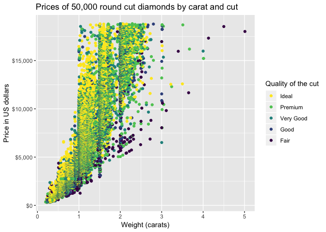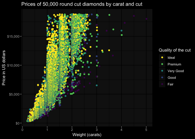 labs(title = "Prices of 50,000 round cut diamonds by carat and cut",