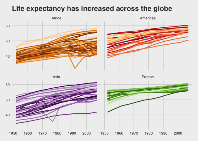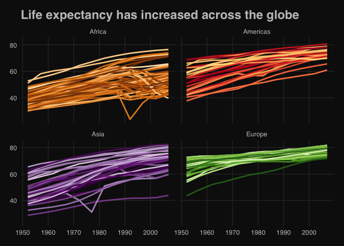 geom_line(aes(year, lifeExp, group = country, color = country), lwd = 1, show.legend = FALSE) +