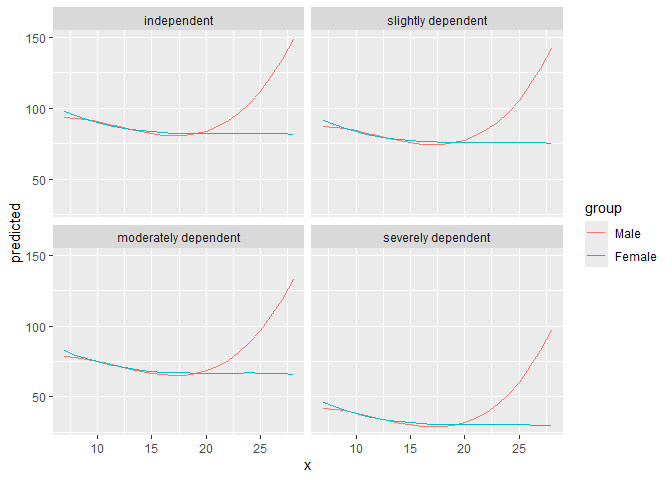 The returned data frames always have the same, consistent structure and column names, so it’s easy to create ggplot-plots without the need to re-write the function call. x and predicted are the values for the x- and y-axis. conf.low and conf.high could be used as ymin and ymax aesthetics for ribbons to add confidence bands to the plot. group can be used as grouping-aesthetics, or for faceting.