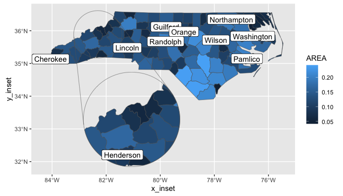 The package implements insets by duplicating and transforming spatial data within a single coordinate system. That means that you don’t get separate grid lines for the inset panel and, more significantly, the inset can be distorted by the projection of the base map if you move it too far. This tends not to be a problem in practice if you choose a coordinate system that isn’t too distorted over the area of the base map.