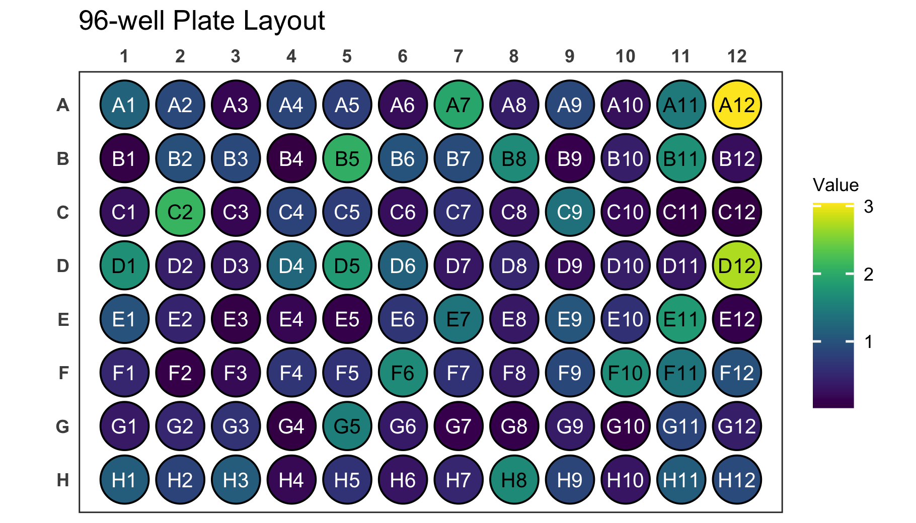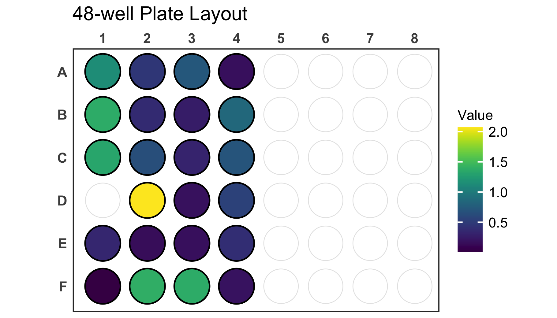 The goal of the ggplate package is to enable users to create simple plots of biological culture plates as well as microplates. Both continuous and discrete values can be plotted onto the plate layout.
