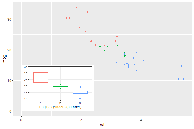 Inset plot positioned using native plot coordinates (npc) using numerical values in the range 0..1 together with I().