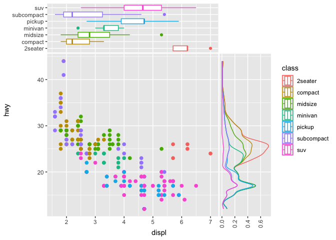 Using this package is similar to adding any additional layer to a ggplot. All geometries supported by ggside follow a pattern like geom_xside* or geom_yside* which will add that geometry to either the x side panel or the y side panel respectively. If you add geom_xsidedensity to a plot, then this places a density geometry in its own panel that is positioned by default above the main panel. This panel will share the same x axis of the main panel but will have an independent y axis. Take the following example from the ggplot2 readme.
