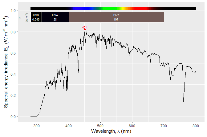 Package ‘ggspectra’ provides stats, geoms, scales and functions to be used for plotting radiation-related spectra and annotating the plots with quantities derived from spectral data. All summary quantities implemented in ‘photobiology’ can be used for annotations including biologically effective irradiances and exposures.