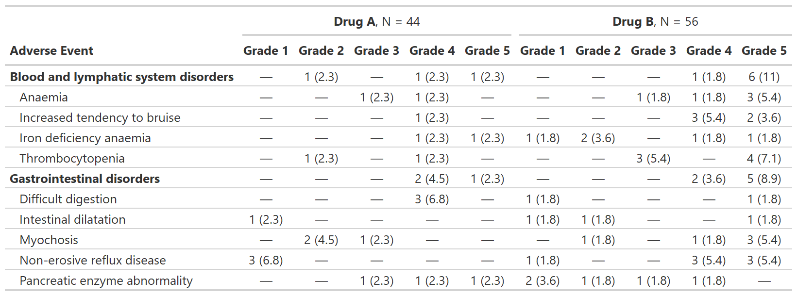 tbl_ae() counts one AE per subject by maximum grade; percentage statistics are provided by default with the denominators reflecting the number of patients in the study.
