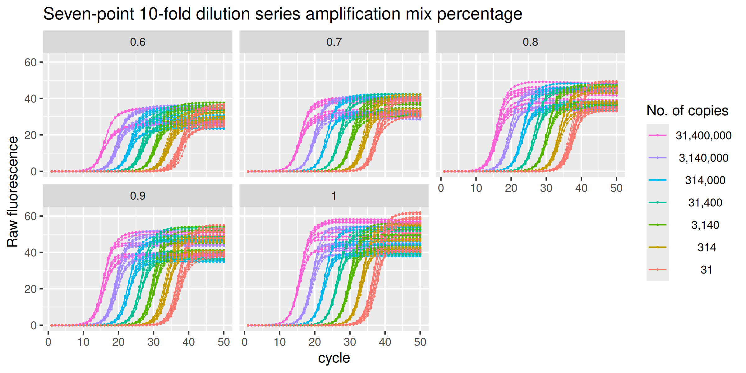 labs(y = "Raw fluorescence", colour = "No. of copies", title = "Seven-point 10-fold dilution series amplification mix percentage") +