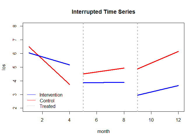 We can also perform an ITS on binary outcomes like death within 30-days. We will examine an intervention and control group at months 5 and 9, which is specified with interrupt= c(5, 9) and its=“two”.
