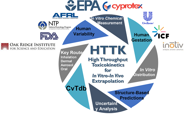 Pre-made models that can be rapidly tailored to various chemicals and species using chemical-specific in vitro data and physiological information. These tools allow incorporation of chemical toxicokinetics (“TK”) and in vitro-in vivo extrapolation (“IVIVE”) into bioinformatics, as described by Pearce et al. (2017). Chemical-specific in vitro data characterizing toxicokinetics have been obtained from relatively high-throughput experiments. The chemical-independent (“generic”) physiologically-based (“PBTK”) and empirical (for example, one compartment) “TK” models included here can be parameterized with in vitro data or in silico predictions which are provided for thousands of chemicals, multiple exposure routes, and various species. High throughput toxicokinetics (“HTTK”) is the combination of in vitro data and generic models. We establish the expected accuracy of HTTK for chemicals without in vivo data through statistical evaluation of HTTK predictions for chemicals where in vivo data do exist. The models are systems of ordinary differential equations that are developed in MCSim and solved using compiled (C-based) code for speed. A Monte Carlo sampler is included for simulating human biological variability (Ring et al., 2017) and propagating parameter uncertainty (Wambaugh et al., 2019). Empirically calibrated methods are included for predicting tissue:plasma partition coefficients and volume of distribution (Pearce et al., 2017). These functions and data provide a set of tools for using IVIVE to convert concentrations from high-throughput screening experiments (for example, Tox21, ToxCast) to real-world exposures via reverse dosimetry (also known as “RTK”) (Wetmore et al., 2015).