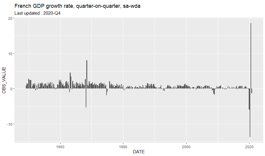 ggtitle("French GDP growth rate, quarter-on-quarter, sa-wda") +
