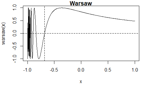 The Warsaw function \(w(x) = I(x > -1)\left(1 + \sin\left(\frac{1}{1+x}\right)\right)-1\) has multiple roots.