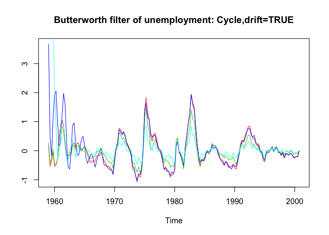 main="Butterworth filter of unemployment: Cycle,drift=TRUE",