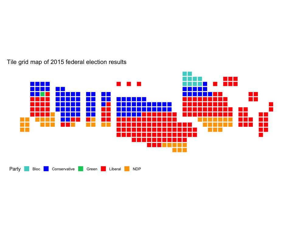 riding_binplot() can be used to create tile cartograms at federal and provincial riding levels (note that only Quebec provincial ridings are supported right now). Here is an example: