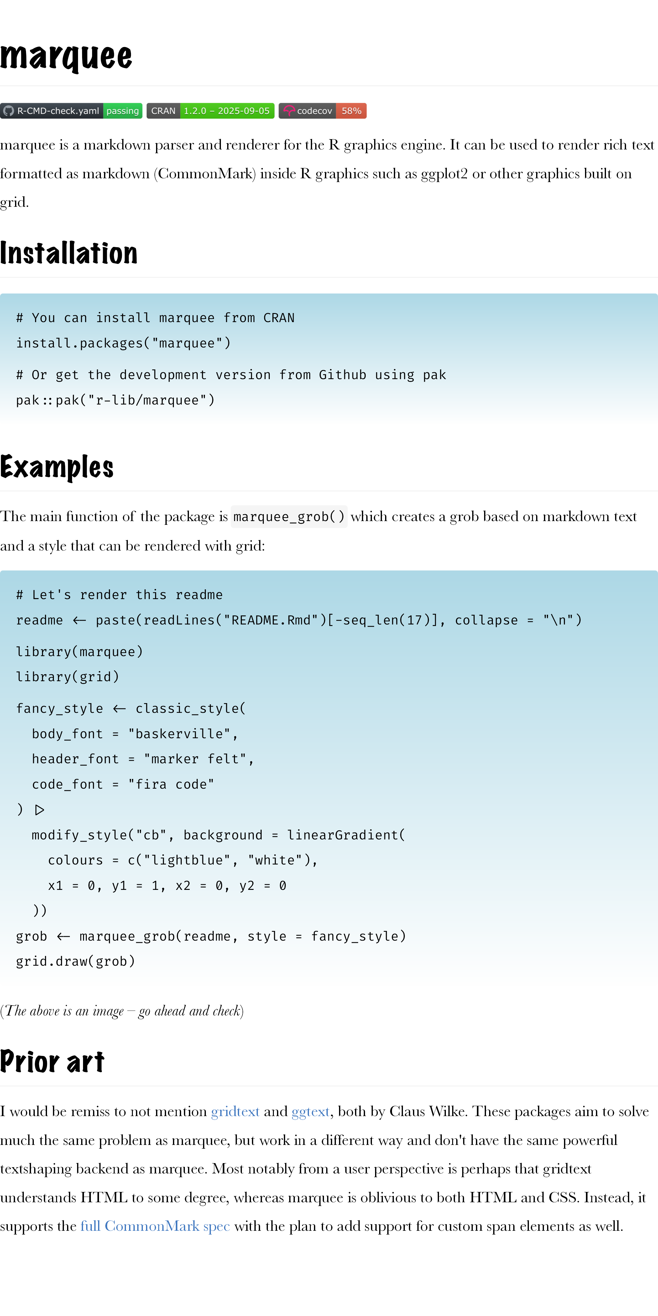 I would be remiss to not mention gridtext and ggtext, both by Claus Wilke. These packages aim to solve much the same problem as marquee, but work in a different way and don’t have the same powerful textshaping backend as marquee. Most notably from a user perspective is perhaps that gridtext understands HTML to some degree, whereas marquee is oblivious to both HTML and CSS. Instead, it supports the full CommonMark spec with the plan to add support for custom span elements as well.