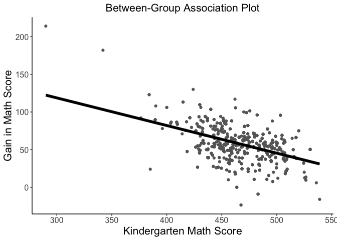 betweenPlot(x = "mathkind", y = "mathgain", grouping = "classid", dataset = instruction, xlab = "Kindergarten Math Score", ylab = "Gain in Math Score")