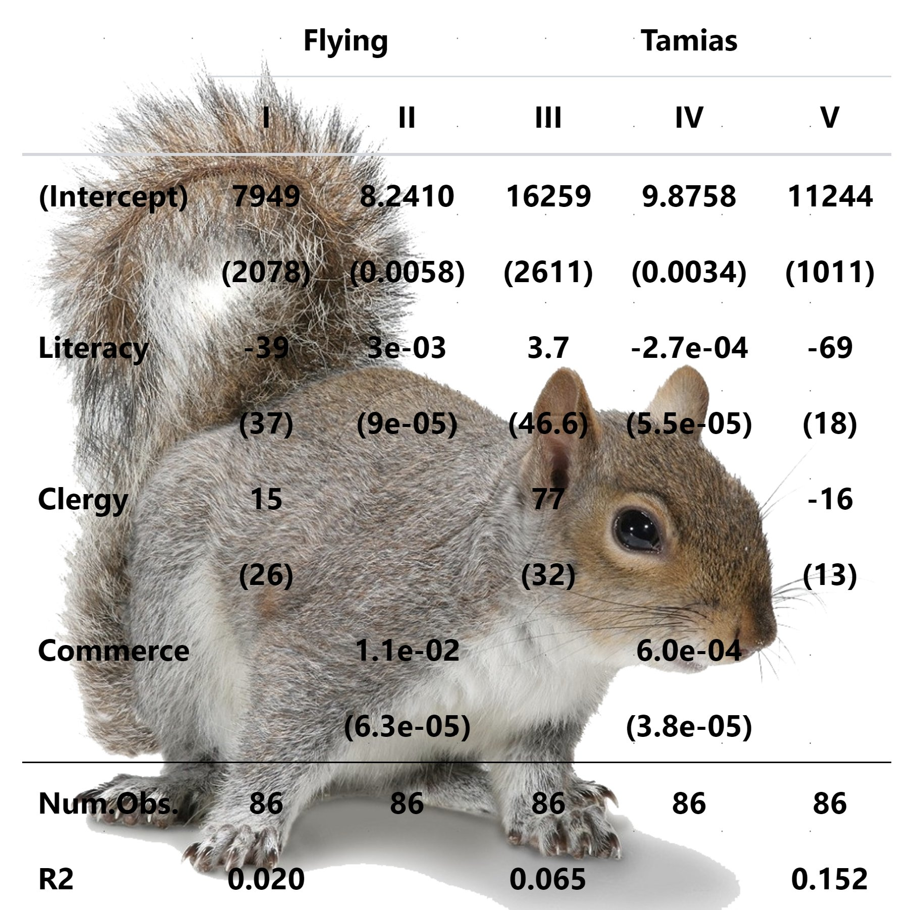 modelsummary is dangerous! It allows users to do stupid stuff like inserting squirrels in all your tables.