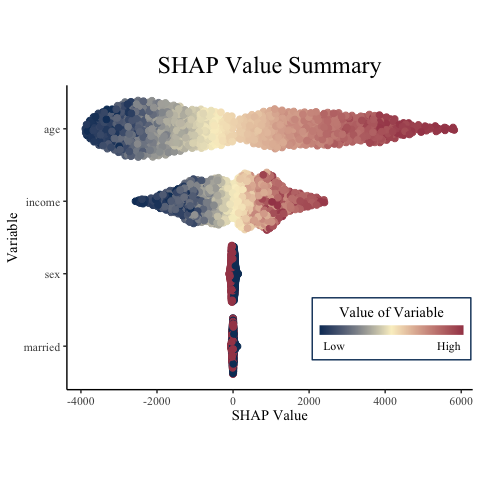 This package is designed in R with the example use cases having models and shap values calculated in python. It is the hope that the interoperability between the two languages continues to grow, and the example here makes a strong case for the ease of transitioning between the two.