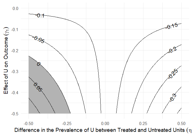 The plot.sens() function visualizes the sensitivity analysis by showing contours of bias-adjusted estimates under different values of γ and η.