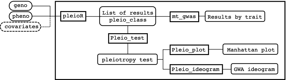 Figure 1 shows a schematic view of how the package is structured and how inputs, functions, and outputs are linked to each other on a conceptual pipeline. The main function pleioR() takes as input the phenotype (pheno) and genotype (geno) data, and possibly covariates (covariates). The results are returned in a list of class pleio_class. The pheno data consists of a dataframe that has IDs, traits, and observations arranged in columns. The geno data can be a numeric matrix or a memory-mapped matrix (e.g., a BEDMatrix object), with ID names in rows matching those in pheno. The package allows performing computations using subsets of the rows and columns in geno (see arguments i and j, for specifying rows and columns, respectively). The results produced by pleioR() can be processed either by the mt_gwas() function, which returns trait-specific SNP-effect estimates, SE, and p-values from the multi-trait model; or by the pleio_test() function, which performs the sequential test for pleiotropy using Wald’s test, and returns its p-values indicating which traits are associated with a particular variant. Finally, the functions pleio_plot() and pleio_ideogram() can be used to plot the results of pleio_test() with many arguments dedicated to fine-tuning.