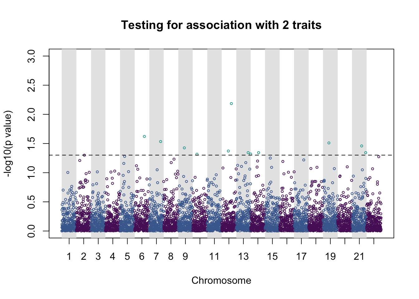 pleio_plot(pleio_res = pleio_result4, n_traits = 2, alpha = .05, bp_positions = bp_positions, chr_spacing = 1000)
