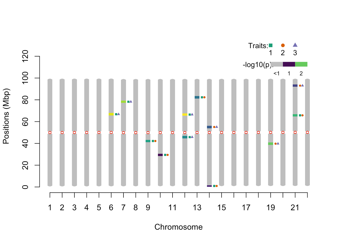 pleio_ideogram(pleio_res = pleio_result4, n_traits = 2, alpha = .05, bp_positions = bp_positions, window_size = 1e6, centromeres = centromeres, set_ylim_prop = 1.3)