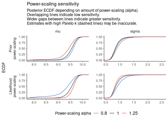 It currently includes functions for performing power-scaling sensitivity analysis on Stan models. This is a way to check how sensitive a posterior is to perturbations of the prior and likelihood and diagnose the cause of sensitivity. For efficient computation, power-scaling sensitivity analysis relies on Pareto smoothed importance sampling (Vehtari et al., 2024) and importance weighted moment matching (Paananen et al., 2021).