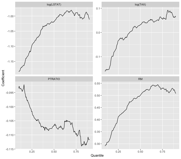 <- data.frame(c(t(beta_hat)), rep(tau, p), rep(c('RM', 'log(TAX)', 'PTRATIO', 'log(LSTAT)'), each = length(tau)))