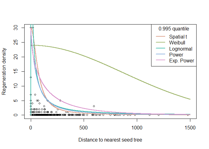 The results of the quantile regression for the different dispersal kernels can be visualised and compared. We are now ready to add the estimated functions to the plot. Since quax directly returns those functions, this is conveniently done with the curve function.