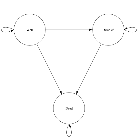 a semi-Markov process with three states: “Well”, “Disabled” and “Dead”