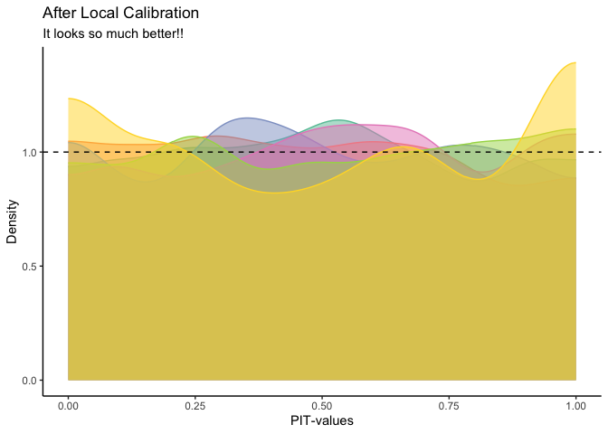 We see now that the pit-values are approximately uniform, at least globally. Bellow, we also see that the local calibration is improved.