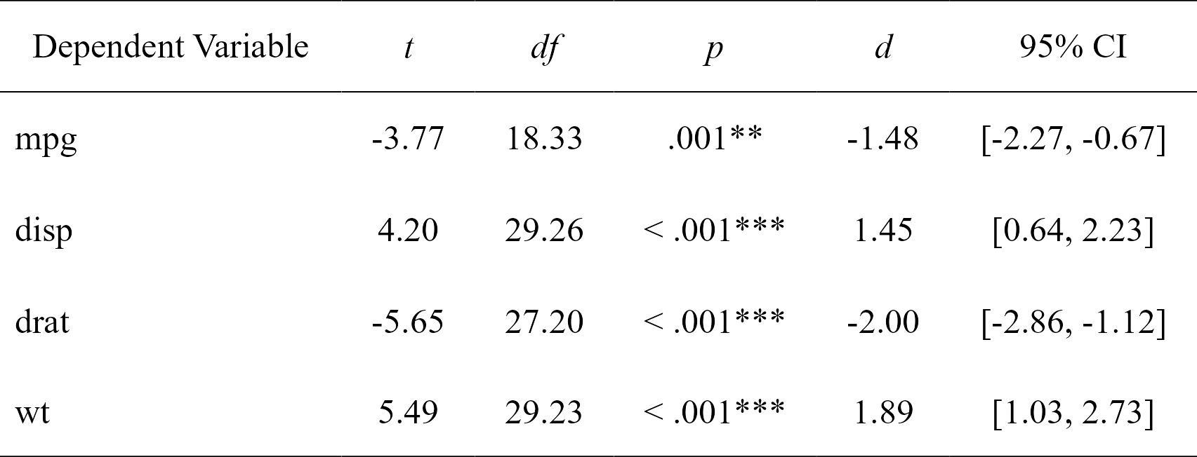 Easily compute t-test analyses, with effect sizes, and format in publication-ready format. Supports multiple dependent variables at once. The 95% confidence interval is for the effect size (Cohen’s d).