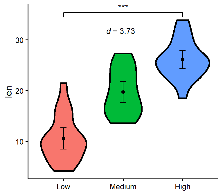 Easily compute regression with planned contrast analyses (pairwise comparisons similar to t-tests but more powerful when more than 2 groups), and format in publication-ready format. Supports multiple dependent variables at once (but supports only three groups for the moment). In this particular case, the confidence intervals are bootstraped around the Cohen’s d.