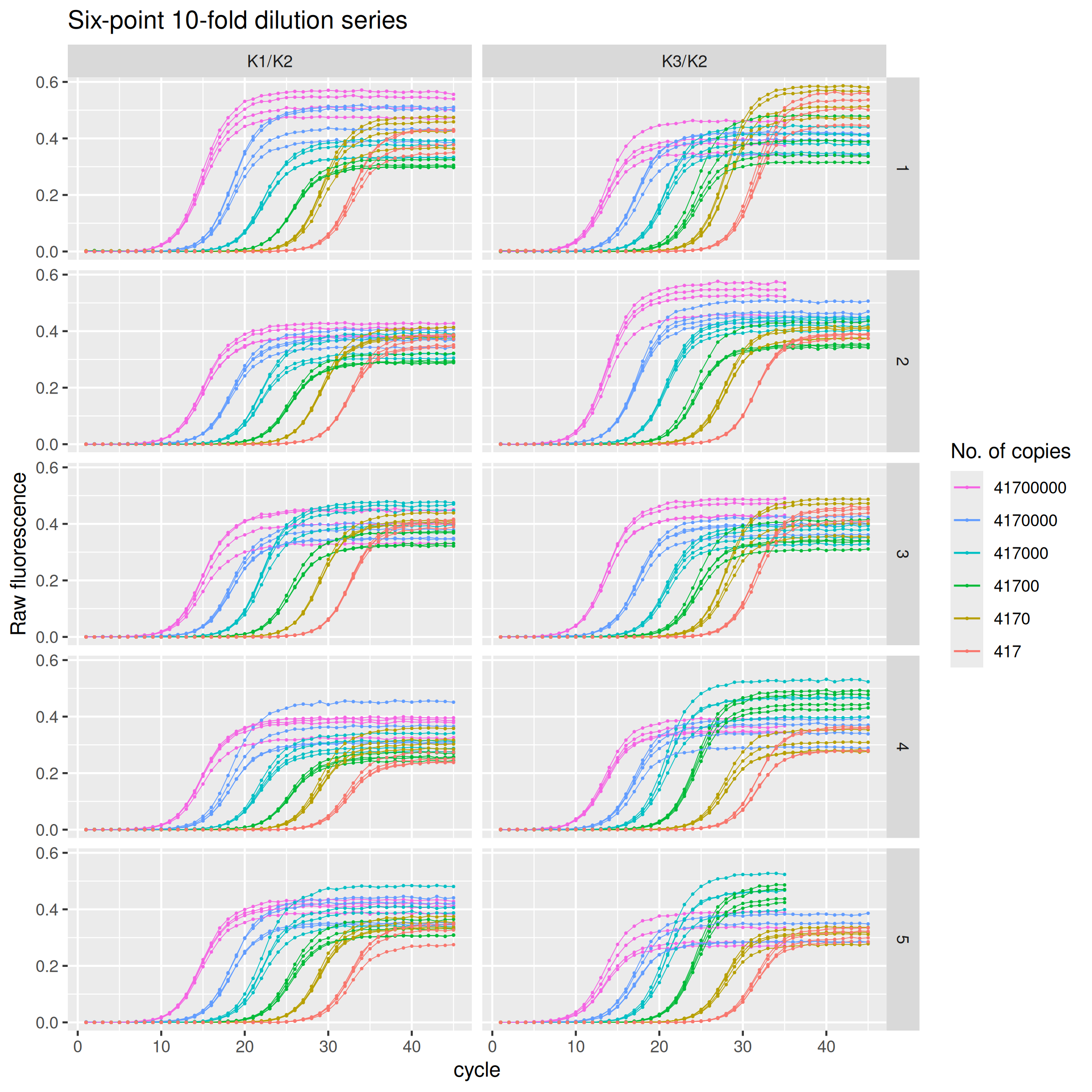 labs(y = "Raw fluorescence", colour = "No. of copies", title = "Six-point 10-fold dilution series") +