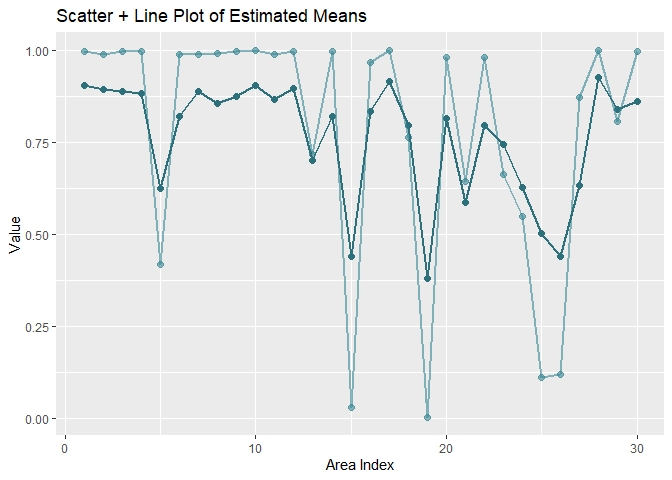 fit <- betaTF(y~X1+X2, area="codearea", weight="w", data=dataBeta, iter.update = 5, iter.mcmc = 10000)Area mean estimation