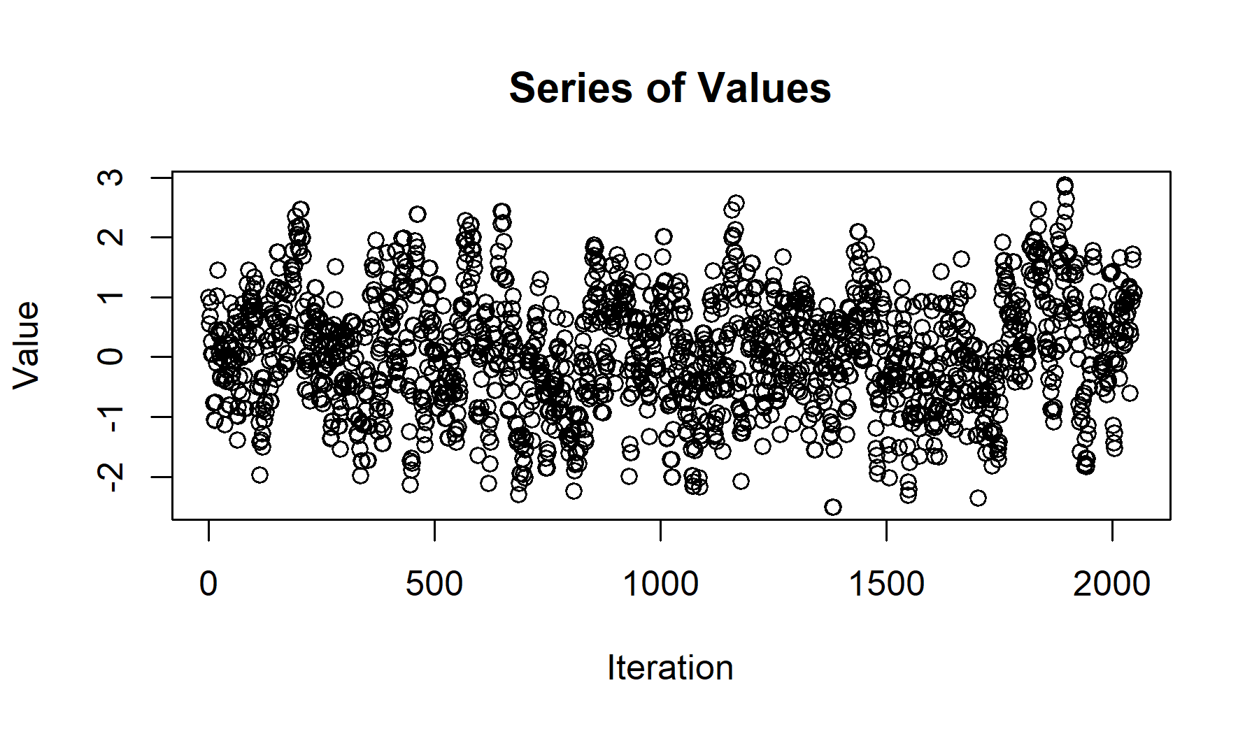 chain <- sampler_mh(start = 1, distr_name = "norm", distr_params = c(0,1), sigma_prop = diag(1) * .5, iterations = 2048)