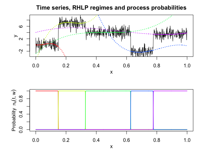 #> The RHLP model selected via the "BIC" has K = 5 regimes