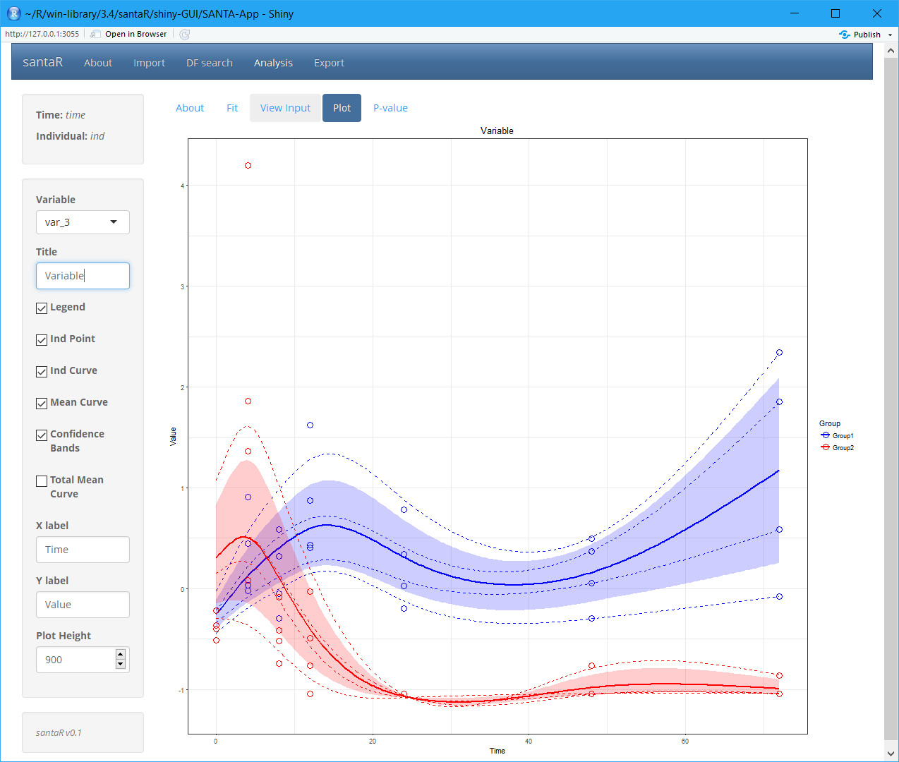Analytes levels are descriptive of the underlying biological state and evolve smoothly through time. For a single analyte, the time trajectory of each individual is described with a smooth curve estimated by smoothing splines. For a group of individuals, a curve representing the group mean trajectory is also calculated. These individual and group mean curves become the new observational unit for subsequent data analysis, that is, the estimation of the intra-class variability and the identification of trajectories significantly altered between groups.