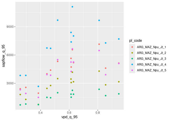 ggplot(arg_maz_metrics, aes(x = vpd_q_95, y = sapflow_q_95, colour = pl_code)) +