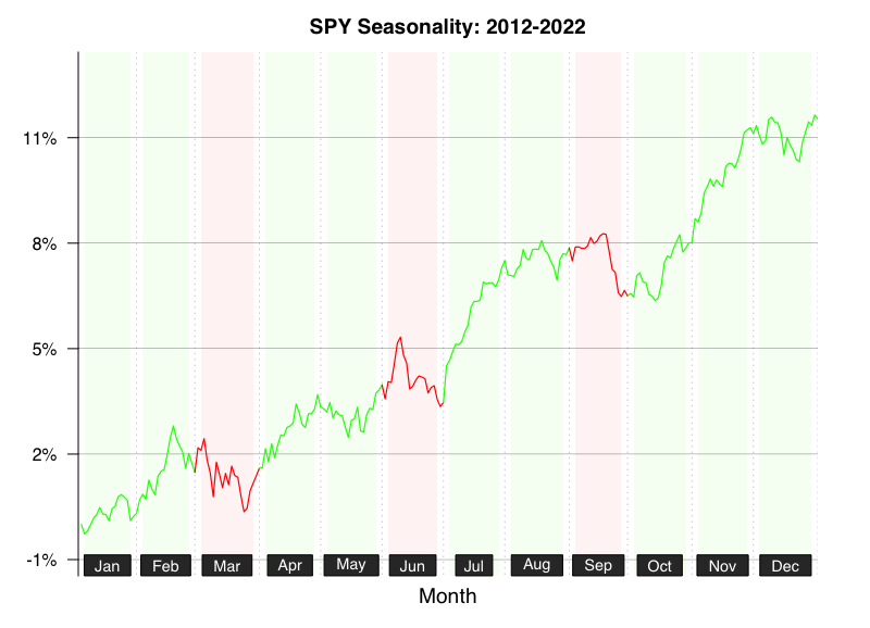 #Plot an averaging seasonality of SPDR S&P500 ETF (SPY) between 2012 and 2022.