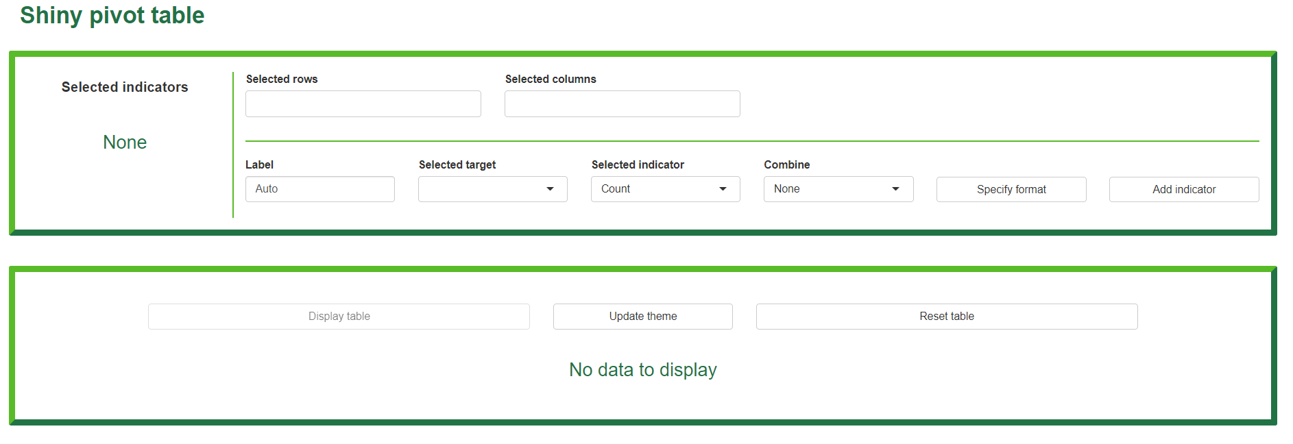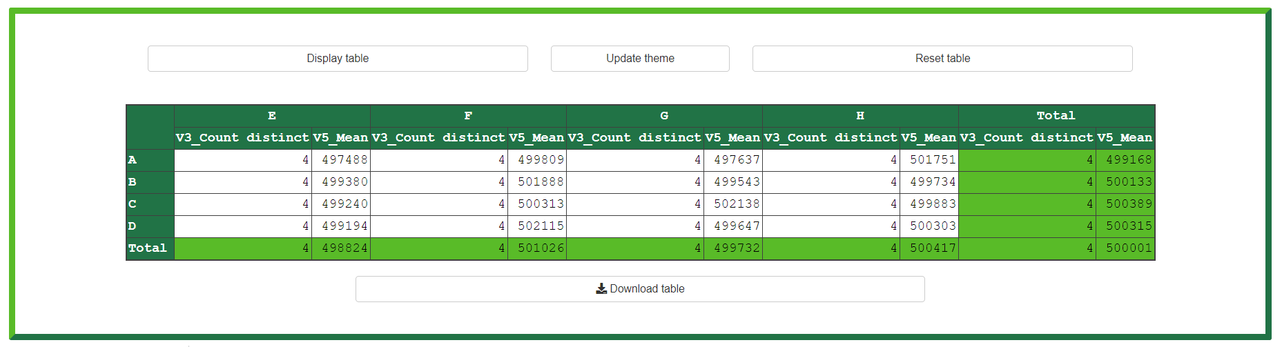 All calculations for the pivot tables take place inside R, enabling the use of a wide-range of R functions in the calculation logic, and are optimized with the use of packages dplyr & data.table