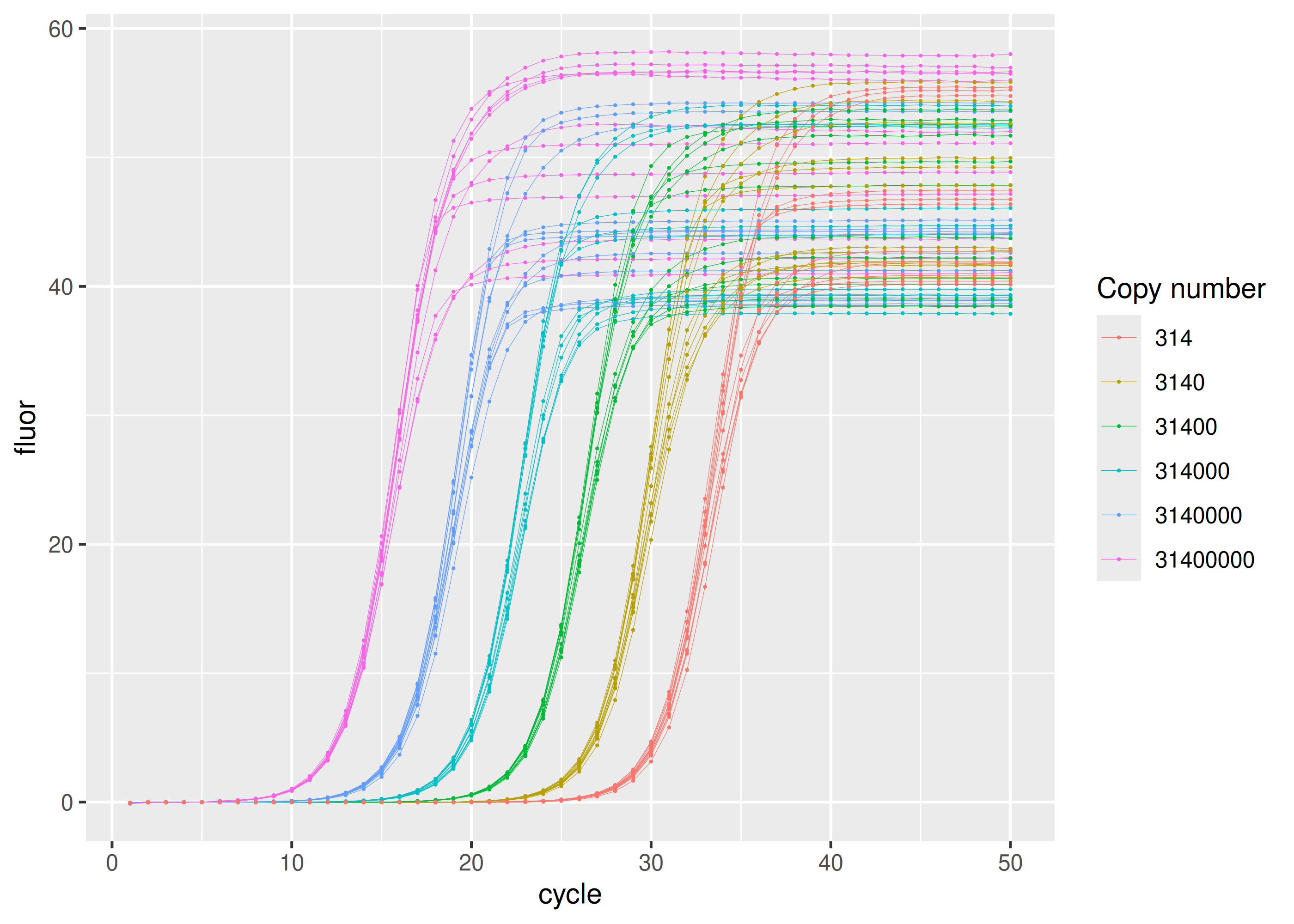Most concentrated set of samples in the dilution series have \(3.14 \times 10^7\) copies of the NADH dehydrogenase 1 (MT-ND1) amplicon. Following samples in the series are ten-fold dilutions.
