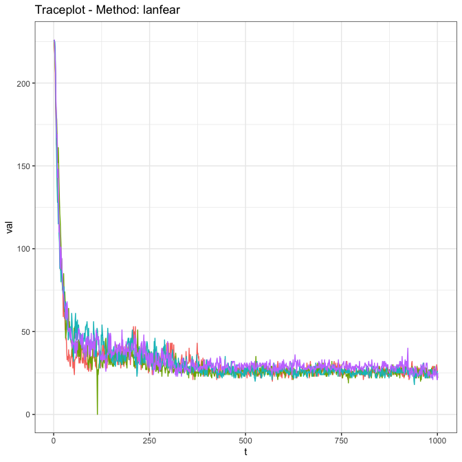 Multivariate, multichain MCMC diagnostics, including traceplots, Gelman-Rubin diagnostics, and effective sample size, are all available for various parameters from the model fit. These are supplied using the genMCMCDiag package, see that packages’ documentation for details.