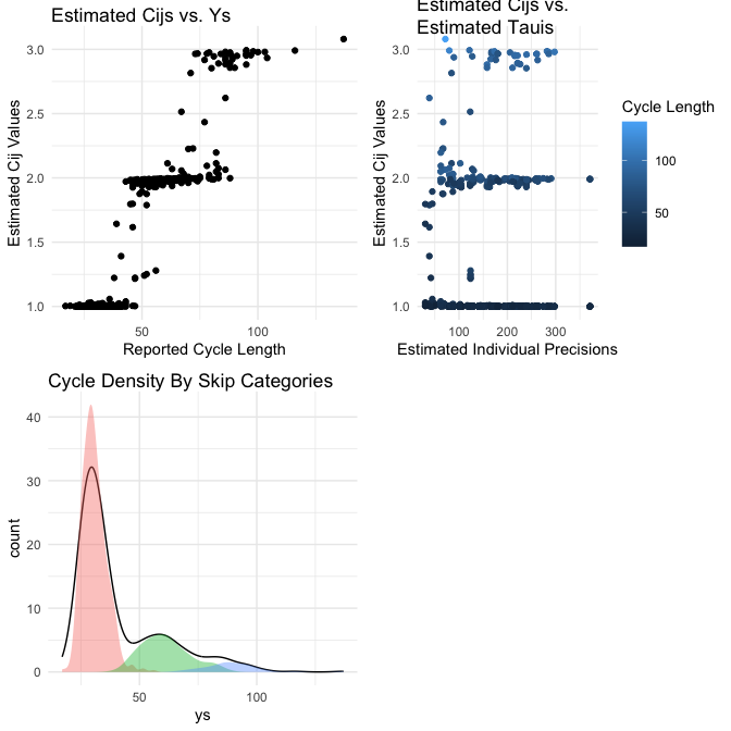 First, we simulate data on 100 individuals from the SkipTrack model where each observed \(y_{ij}\) value has a 75% probability of being a true cycle, a 20% probability of being two true cycles recorded as one, and a 5% probability of being three true cycles recorded as one.