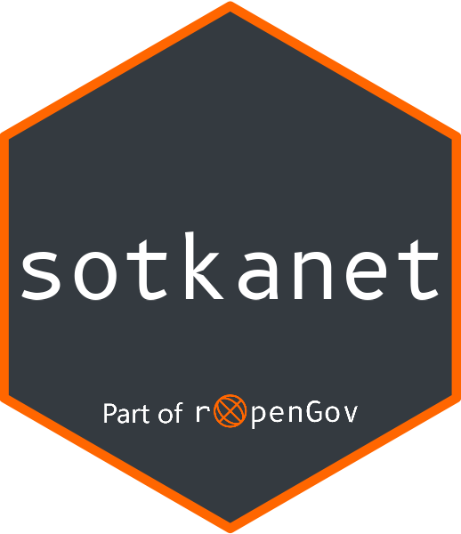 Kindly cite this work as follows: Leo Lahti, Einari Happonen, Juuso Parkkinen, Joona Lehtomaki, Vesa Saaristo, Aleksi Lahtinen and Pyry Kantanen (rOpenGov 2024). sotkanet: Sotkanet Open Data Access and Analysis. R package version 0.9.80. URL: https://github.com/rOpenGov/sotkanet