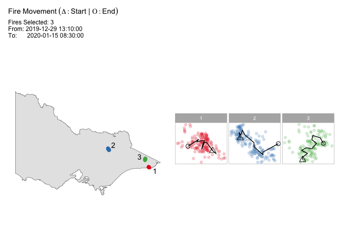 To examine the fire movements, use the option “mov”, and the movement will be shown as connected lines between centroids at each time step, for each cluster.