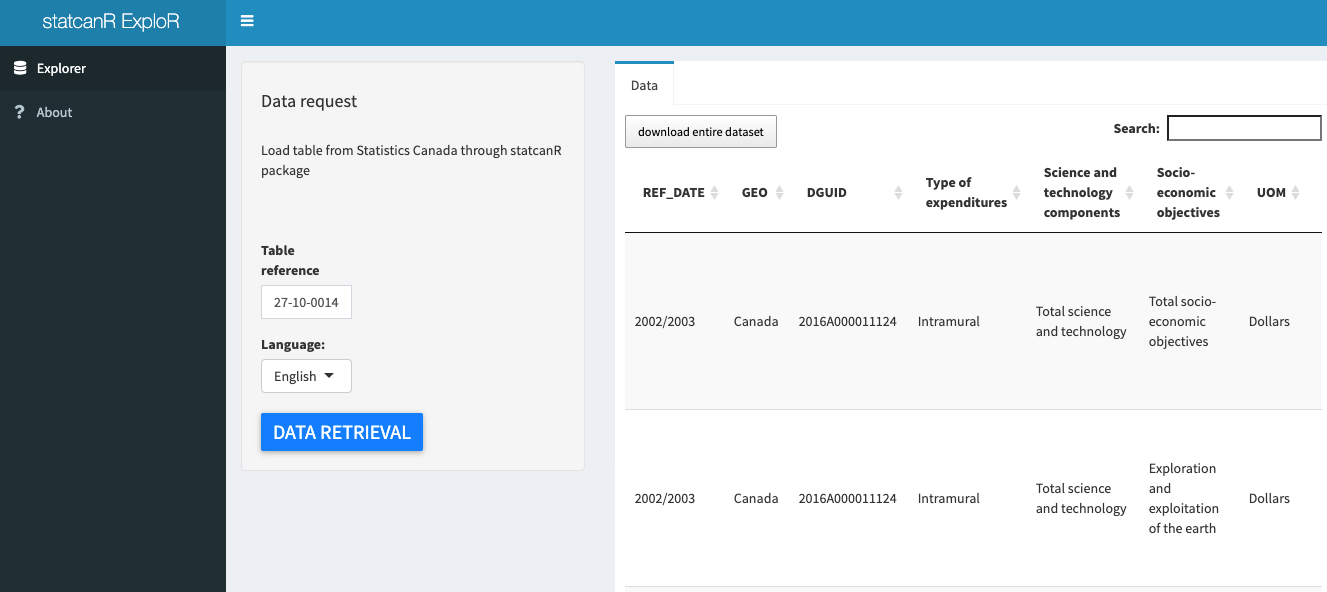 For people less comfortable with R and to allow more people to have access to our package, we have also developed a Shiny application.Through the same logic present in our package, researchers can retrieve data from Statistics Canada.