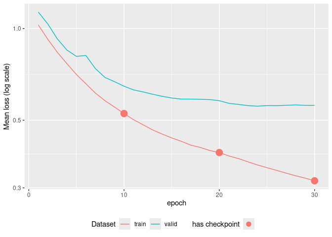 fit <- tabnet_fit(rec, train, epochs = 30, valid_split=0.1, learn_rate = 5e-3)