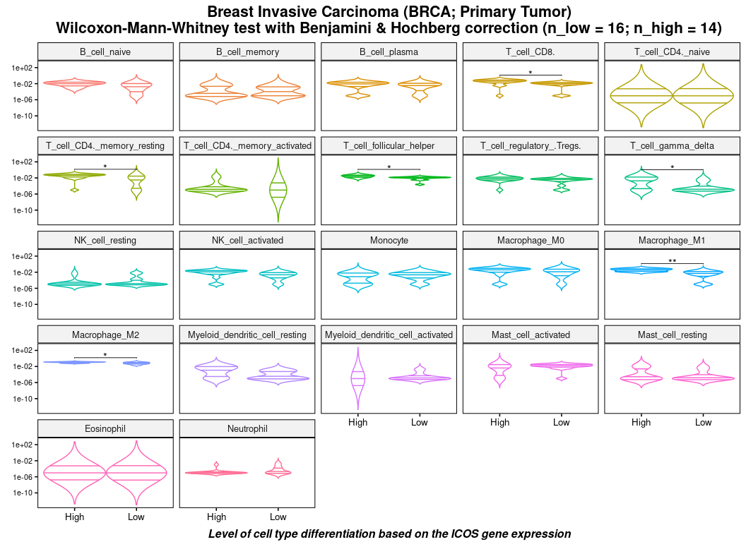 And perform a significance of a Wilcoxon adjusted test according to the expression level (high or low) of a selected gene.