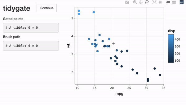 tidygate allows you to interactively gate points on a scatter plot. Interactively drawn gates are recorded and can be applied programmatically to reproduce results exactly. Programmatic gating is based on the package gatepoints by Wajid Jawaid.