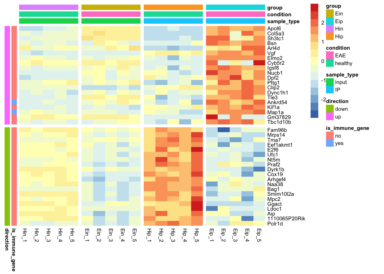 Given a tidy data frame of gene expression data like data_exprs, you can easily generate a customized heatmap. The full documentation can be found here.
