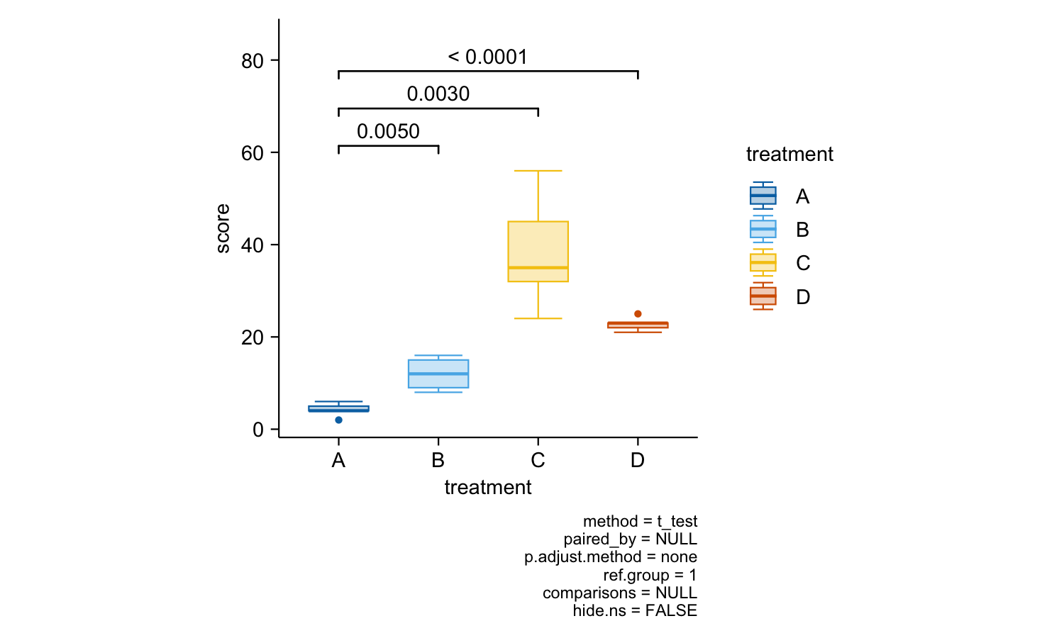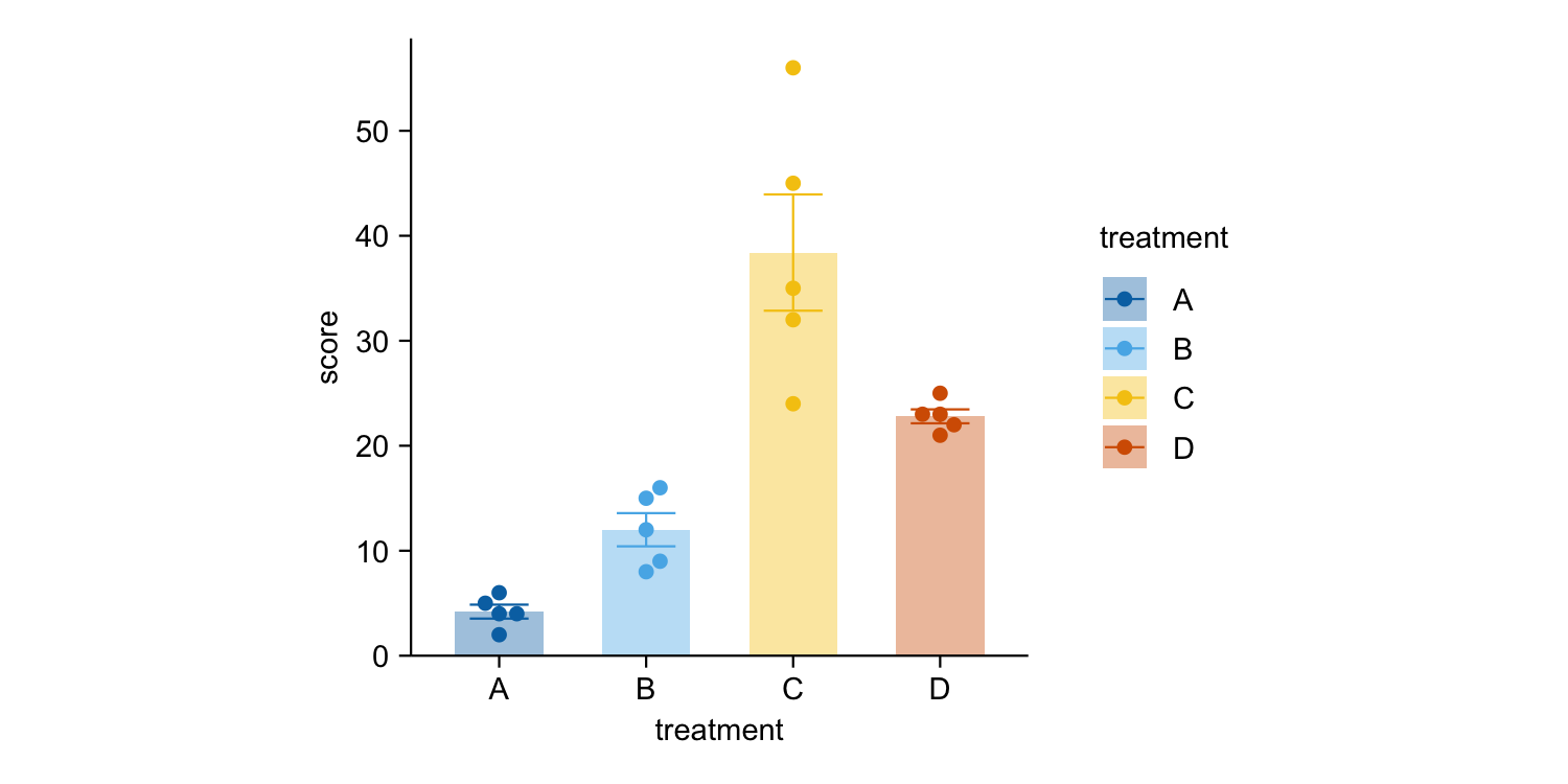 study tidyplot(x = treatment, y = score, color = treatment) |>
